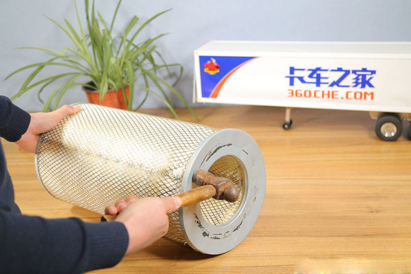 稱重之后接下來我們開始正式拆解,還是首先要將增加濾芯強度的金屬絲網(wǎng)拆掉,經(jīng)過我們一番研究發(fā)現(xiàn),這款濾芯的絲網(wǎng)質(zhì)地非常柔軟,用手指輕輕一按就能夠發(fā)生形變,于是我們決定使用錘子先將連接端蓋處的絲網(wǎng)敲擊變形,再進行下一步的拆解。