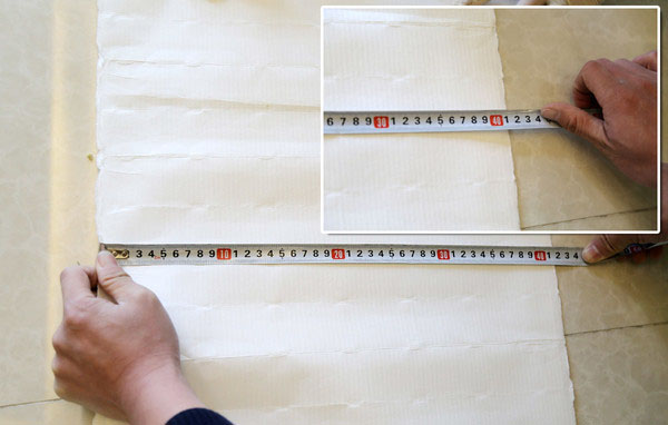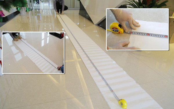 濾紙面積的大小也直接關系著濾芯的過濾能力,接下來我們開始測量這款主芯的濾紙面積,鑒于濾紙的長度過長,我們的測試空間和測量工具受限,所以先將濾紙進行對折,測試一半的長度。我們測試所需的尺子最長只有5米,即使對折之后也要分兩次進行測量。