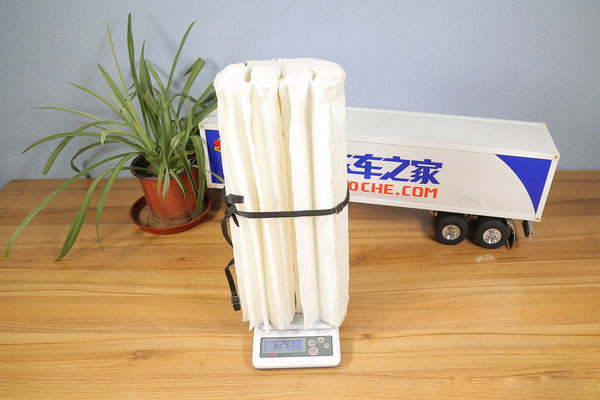 從拆解下來的端蓋上可以清晰的看到,固化的粘結劑經(jīng)過敲擊之后,已經(jīng)出現(xiàn)了大塊脫落。拆下來未經(jīng)粘合的濾紙已經(jīng)散開,我們利用細帶將濾紙捆綁在一起進行稱重,去掉細帶的重量,主芯濾紙的凈重為0.62千克。