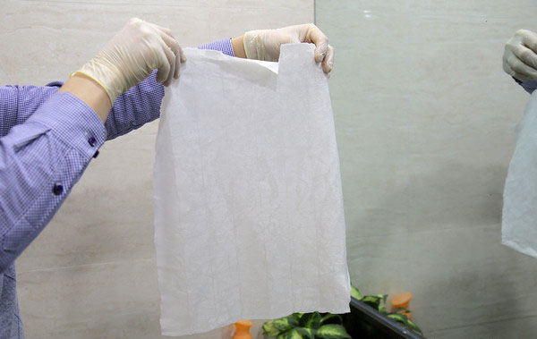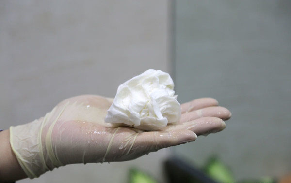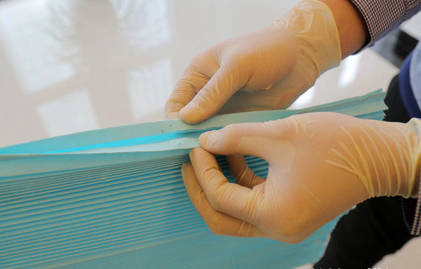 我們又剪下一塊主芯濾紙,將其放置在水槽內(nèi),遇水后濾紙已經(jīng)完全被浸透了,并且從水槽中將濾紙?zhí)崞饋恚谡劬處已經(jīng)出現(xiàn)了斷裂,毫無韌性可言。用手將浸濕的濾紙攥成一團,不僅有水從濾紙中析出,而且外形看上去就像被浸濕的普通紙巾一樣。所以空濾絕不能進入水分,否則會對濾紙造成損壞。