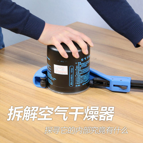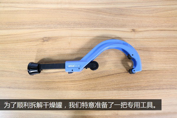 為了能順利的把干燥罐開膛破肚,我們特意準(zhǔn)備了一個專用工具,這樣就能夠比較方便的把外殼切開了。這里給大家透露一下,因?yàn)樗芮懈钭畲?40毫米的管狀物體,所以售價可不菲。