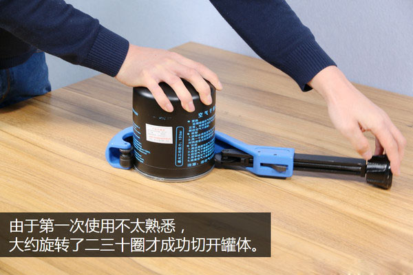 稱完重量就要開始切割了,首先把干燥罐放到切割工具上,調(diào)整好刀具的位置后開始旋轉(zhuǎn)切割,由于這個設(shè)備我也是第一次使用還不太熟練,大概旋轉(zhuǎn)了二三十圈才把罐體切開,但是好在切割過程還算是比較順利,切口也比較整齊,這一點(diǎn)我還是非常滿意的。