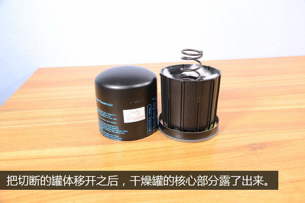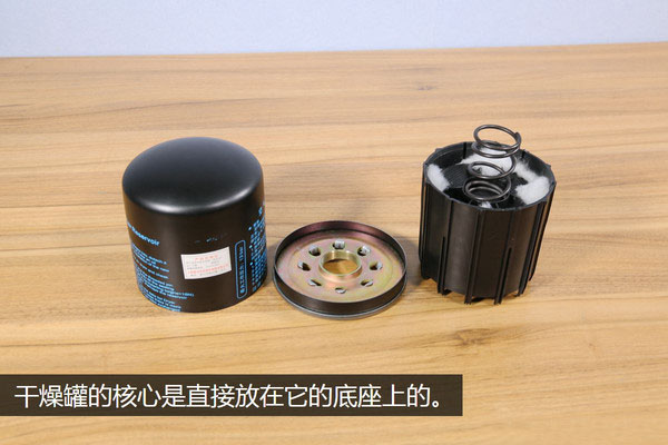 棉絮的究竟是干什么的咱先放一放,先把干燥罐的核心部分從底座上拆下來,拆的過程很簡單,輕輕一提它就下來了,因?yàn)楹诵氖侵苯臃旁诘鬃系,并沒有任何的固定連接。經(jīng)過這樣一番拆解之后,這個干燥罐分為了三個部分,核心、底座、罐體。