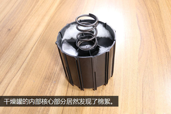 好奇心驅(qū)使我立即把切開的罐體上半部分拿開,這下罐體內(nèi)部的東西就全部暴露在眼前。拿開罐體之后也驗(yàn)證了我之前的猜測,它的里面確實(shí)有一個彈簧,應(yīng)該是用來壓緊干燥罐核心部分的。除了彈簧我還在核心的頂端發(fā)現(xiàn)了棉絮,對,你沒看錯,干燥罐的內(nèi)部居然發(fā)現(xiàn)了棉絮!