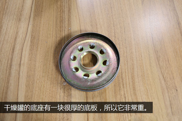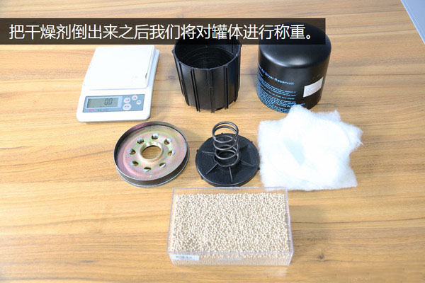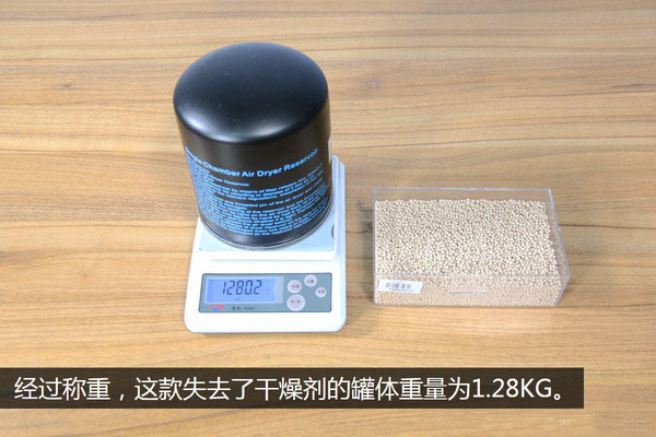 干燥劑的容量是衡量一款干燥罐質(zhì)量的重要指標(biāo),所以我把除干燥劑本身之外的其它零部件全部組合到一起,重新了進(jìn)行一次稱重,發(fā)現(xiàn)失去了干燥劑的罐體有1.28KG重,較拆解之前少了0.63KG,而這一部分的重量就是干燥劑本身的重量。