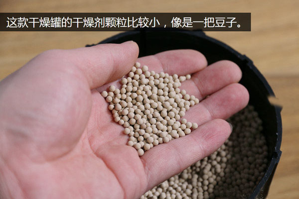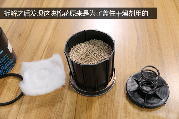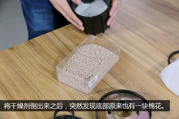 打開蓋子之后,這個干燥罐真正的核心部分,干燥劑終于展現(xiàn)在了我們的面前,用手抓了一些出來發(fā)現(xiàn)顆粒比較細(xì)小,太像某種豆子了,而我的同事則認(rèn)為這玩意像貓屎。