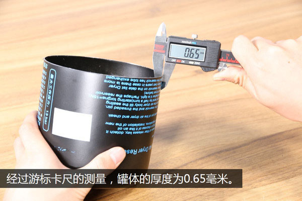 最后用游標(biāo)卡尺測量一下罐體的鐵皮厚度,經(jīng)過測量得到的數(shù)據(jù)是0.65毫米,我個人認(rèn)為這已經(jīng)非常薄了,因?yàn)楣摅w的厚度直接決定了它的抗壓力性能,要知道干燥罐在工作的時候內(nèi)部是有非常大的氣壓的。