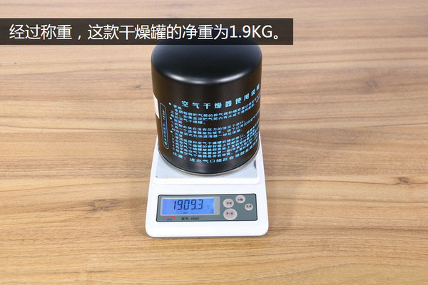 在開始拆解之前,我們要先對這款干燥罐進(jìn)行稱重,這樣也方便和其它的幾款干燥罐進(jìn)行直接的對比。我們使用的這個小稱還是比較精確的,最大能稱5公斤的物體,把干燥罐放上去之后讀數(shù)顯示為1909.3g,也就是1.9公斤多一點(diǎn)點(diǎn)。