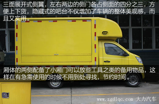 車身兩側(cè)還帶有隱藏式的吧臺(tái),在售賣貨物的時(shí)候只需要將其向下拉即可使用,不僅方便而且還實(shí)用。在后輪的兩側(cè)增加了兩個(gè)工具箱,方便我們放些小東西,例如工具之類,這樣在遇到有需求的時(shí)候可以避免到處尋找。