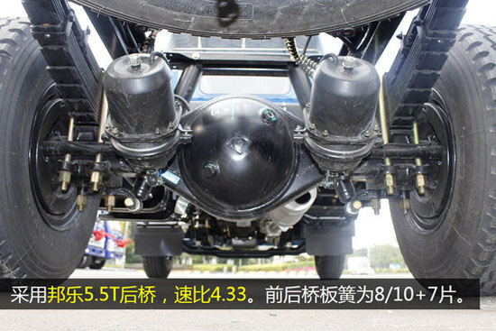 前后橋均采用了多片簧設(shè)計,提升車輛的承載性能。采用邦樂5.5噸級后橋,速比4.33。目前我國的輕卡產(chǎn)品普遍采用的是3.5噸級后橋與5噸級后橋,多利卡D6的5.5噸級算得上是載重量較高的后橋產(chǎn)品了。