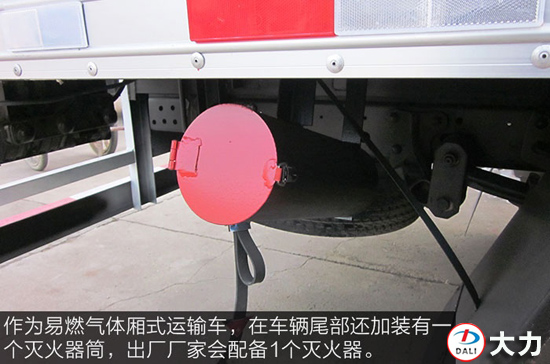 作為易燃?xì)怏w廂式運(yùn)輸車,在車輛尾部還加裝有一個(gè)滅火器筒,出廠廠家會(huì)配備1個(gè)滅火器,發(fā)生緊急情況時(shí)可救急使用。