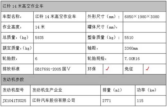 江鈴14米高空作業(yè)車詳細(xì)配置及參數(shù)說明