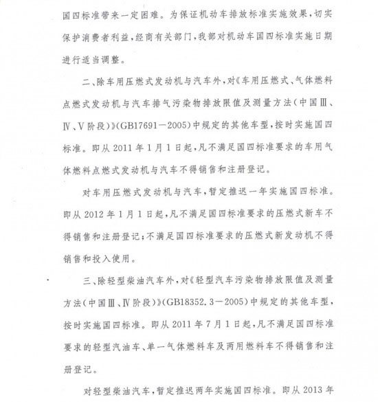 為此,中國汽車工業(yè)協(xié)會在聽取汽車行業(yè)多數(shù)企業(yè)意見和建議的基礎(chǔ)上,向國家環(huán)境保護(hù)部反映了該標(biāo)準(zhǔn)推遲實施的建議。 中國人民共和國環(huán)境保護(hù)部辦公廳于2010年12月21日以環(huán)辦函【2010】1390號《關(guān)于國家機(jī)動車排放標(biāo)準(zhǔn)第四階段限值實施日期的復(fù)函》函復(fù)中國汽車工業(yè)協(xié)會,F(xiàn)將函復(fù)內(nèi)容轉(zhuǎn)告全行業(yè),請行業(yè)嚴(yán)格按照國家要求認(rèn)真執(zhí)行。