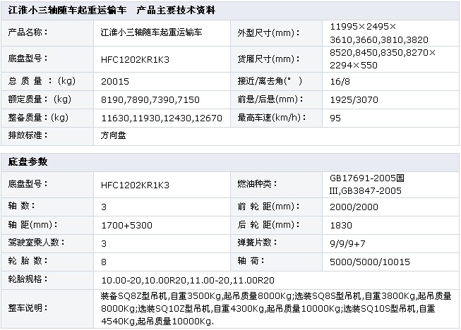 江淮小三軸隨車起重運(yùn)輸車  底盤型號:HFC1202KR1K3 額定質(zhì)量:8190,7890,7390,7150