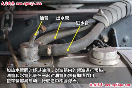 水加熱探管采用發(fā)動(dòng)機(jī)循環(huán)水的溫度來加熱油箱內(nèi)柴油,類似給油箱內(nèi)加裝了“暖氣片”。詳細(xì)改裝過程請點(diǎn)擊《柴油加熱器》一帖。這類改裝能夠保證安全性,加熱穩(wěn)定,配合加裝柴油鍋爐,將使車輛順利完成冷啟動(dòng)過程。