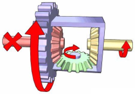 在泥濘或冰雪路段,當(dāng)一側(cè)車輪失去抓地后,相當(dāng)于沒(méi)有阻力,另一側(cè)的車輪相當(dāng)于固定在那里了,行星齒輪的自轉(zhuǎn)將動(dòng)力全部傳遞到失去抓地力的那側(cè)車輪,而車子卻只能呆在原地不動(dòng)。